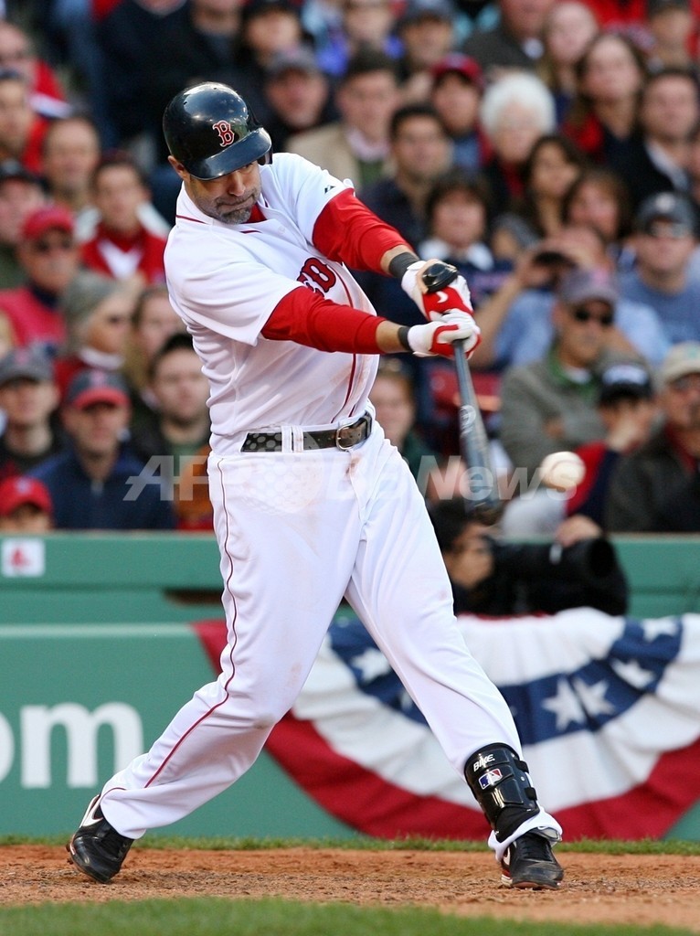 エンゼルスは9回二死、ボビー・アブレイユ(%%Bobby Abreu%%)の適時打二塁打とブラディミール・ゲレーロ(%%Vladimir Guerrero%%)の2点適時打で3点を挙げて逆転した。写真は8回、適時打を放つレッドソックスのマイク・ローウェル(%%Mike Lowell%%)。(2009年10月11日撮影)(c)AFP/Getty Images/Jim Rogash