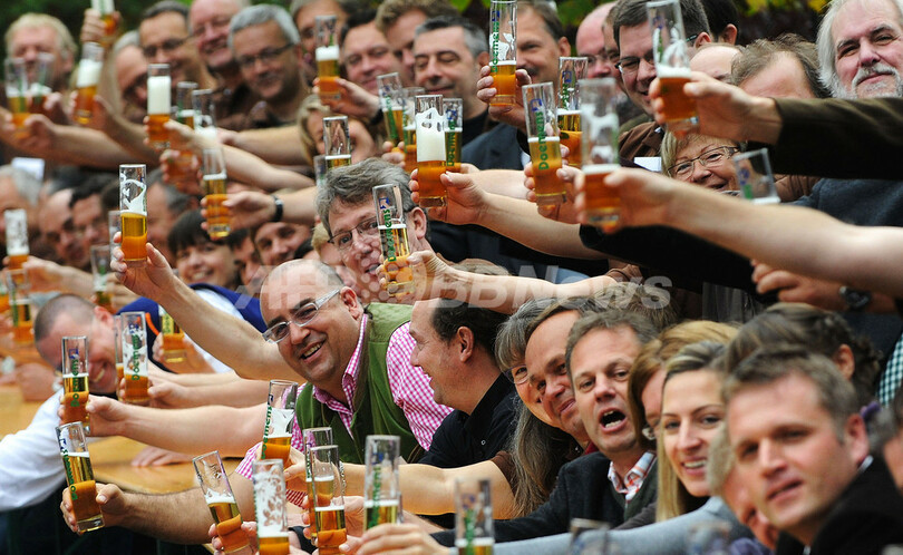 写真は、さまざまな種類のビールを手に乾杯する食品専門家(2009年10月9日撮影)。(c)AFP/DDP/OLIVER LANG