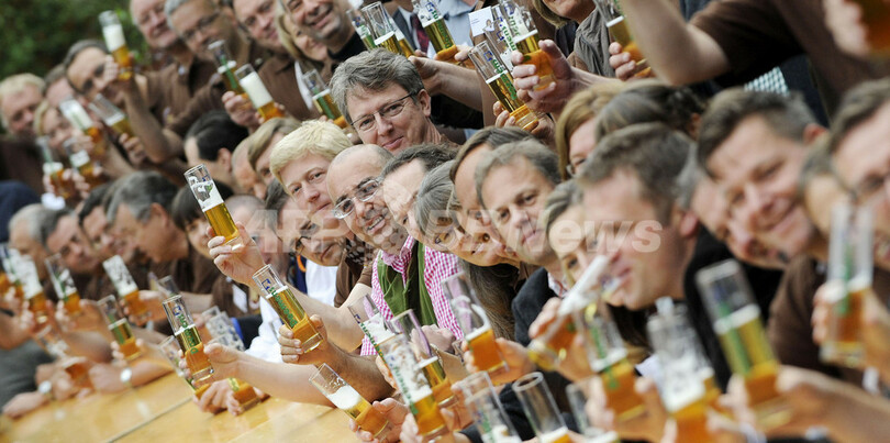 写真は、さまざまな種類のビールを手に乾杯する食品専門家(2009年10月9日撮影)。(c)AFP/DDP/OLIVER LANG