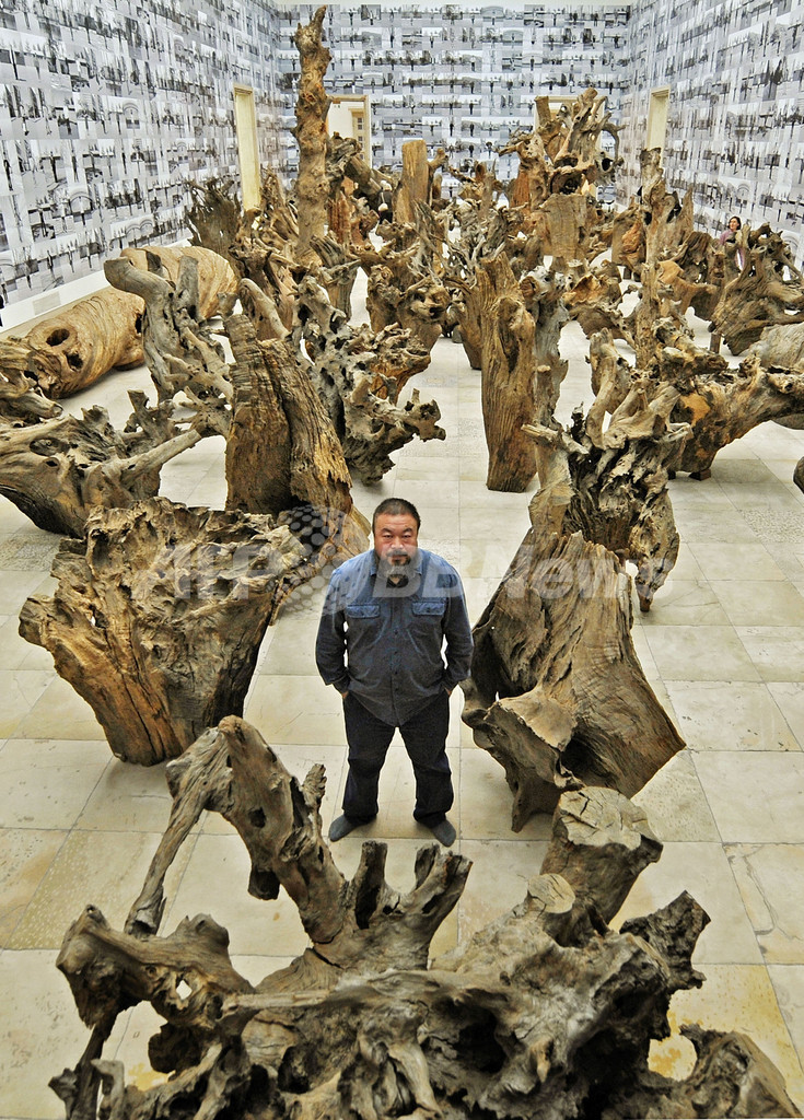 写真は、ハウス・デア・クンストに展示された100個の木片を使った作品「Rooted Upon(ルーテッド・アポン)」(2009年)の中に立つアイ・ウェイウェイ(2009年10月9日撮影)。(c)AFP/DDP/JOERG KOCH