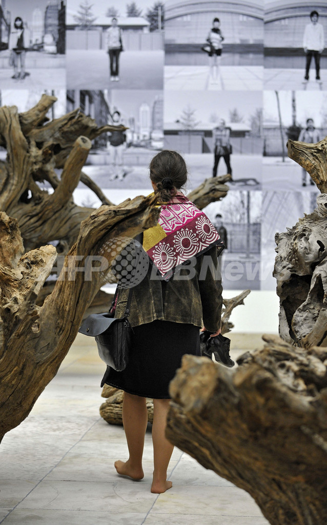 写真は、ハウス・デア・クンストに展示された100個の木片を使った作品「Rooted Upon(ルーテッド・アポン)」(2009年)を裸足で見る来場者(2009年10月9日撮影)。(c)AFP/DDP/JOERG KOCH