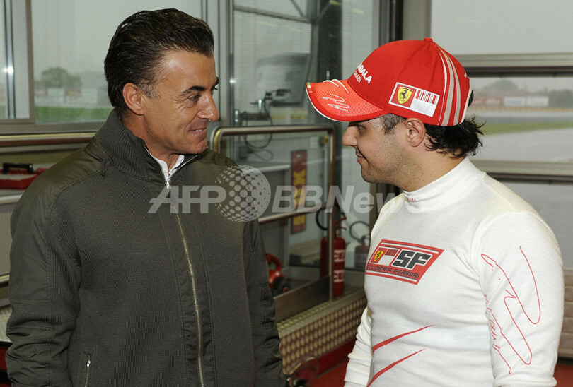 マッサは、フェラーリが所有するフィオラーノ・テスト・トラック(Fiorano Test Track)で2007年型のマシン「F2007」に搭乗し、数周を走行した。写真はテスト走行を終えて元F1ドライバーのジャン・アレジ(%%Jean Alesi%%)氏と言葉を交わすフェリペ・マッサ(右)。(2009年10月12日撮影)(c)AFP/FERRARI PRESS OFFICE/ERCOLE COLOMBO