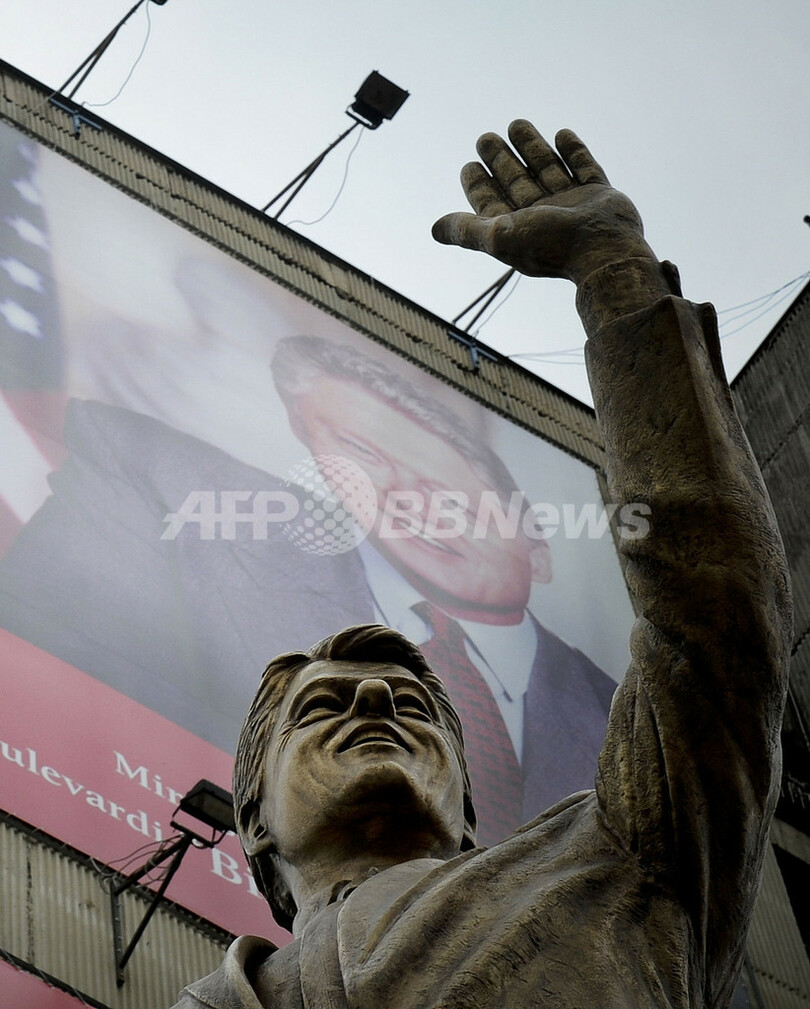 【10月14日 AFP】コソボ・プリシュティナ(Pristina)に建つビル・クリントン(Bill Clinton)元米大統領の像。コソボのアルバニア系住民は、1999年に北大西洋条約機構(NATO)がユーゴスラビア空爆を行った際のクリントン氏の功績をたたえ、すでに元大統領の名がつけられていた大通りに高さ3メートルの像を建立した。大通りにはクリントン氏が描かれた高さ12メートルの壁画も掲げられている。クリントン氏は11月、「コソボの救世主クリントン」像の落成式に出席する。(c)AFP
