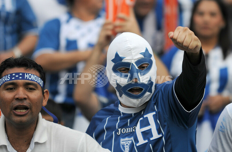 ホンジュラスは後半19分にカルロス・パボン(%%Carlos Pavon%%)が得点を決めて勝利し、米国と2-2で引き分けたコスタリカと勝ち点16で並び得失点差で上回り、本大会への切符を手にした。写真はホンジュラスを応援するファン。(2009年10月14日撮影)(c)AFP/JOSE CABEZAS