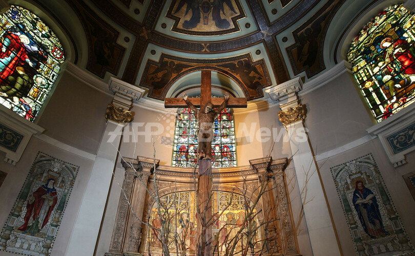 【10月17日 AFP】英ロンドン(London)西部マリルボーン(Marylebone)のかつて教会として使われていた建物で「The Age of the Marvellous(驚異の時代)」と題された現代美術の展示会が開催され、十字架にはり付けにされたゴリラの作品などが展示された。