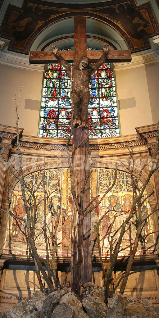 十字架にかけられた本物そっくりのゴリラ、ロンドンの元教会のギャラリーで現代美術展示会
