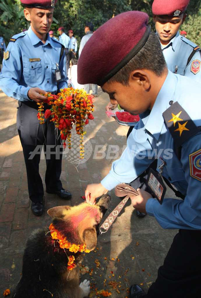 ニュース ライフ ヒンズー教光の祭り「ティハール」、犬を花輪で祝福 ネパール 2009年10月17日 17:15 発信地:カトマンズ/ネパール [ アジア・オセアニア ネパール ] このニュースをシェア ‹ › ❮ 7/8 ❯ ネパール・カトマンズ(Kathmandu)で17日、ヒンズー教の大祭の1つである光の祭り「ティハール(Tihar)」が行われた。ネパールでは、犬はヒンズー教の死の神ヤマラージャ(Yamaraj)の使いという信仰があり、犬を祝福する習慣がある。写真は、犬のおでこに朱(しゅ)を塗り、首にマリーゴールドの花輪をかける警官たち(2009年10月17日撮影)。(c)AFP/Prakash MATHEMA 画像作成中 ! 【10月17日 AFP】ネパール・カトマンズ(Kathmandu)で17日、ヒンズー教の大祭の1つである光の祭り「ティハール(Tihar)」が行われた。(c)AFP ライフ 一覧へ> メディア・報道関係・法人の方向け 写真・動画 購入のお問合せ>