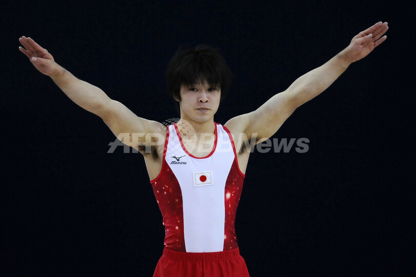 男子ゆかに出場した内村航平(Kohei Uchimura)は15.475点で4位、沖口誠(Makoto Okiguchi)は15.425点で5位だった。(c)AFP