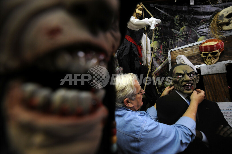 キリスト教の「万聖節」の前夜にあたるハロウィーン(Halloween)に向けて、米国ではバラク・オバマ(Barack Obama)大統領など「今年の顔」の仮装用マスクが登場している。写真は米メリーランド州シルバースプリングのパーティーグッズ店で、オバマ大統領のマスクを陳列する店主のロイ・ハインズ(Ron Hinds)さん(2009年10月16日撮影)。(c)AFP/Jewel SAMAD
