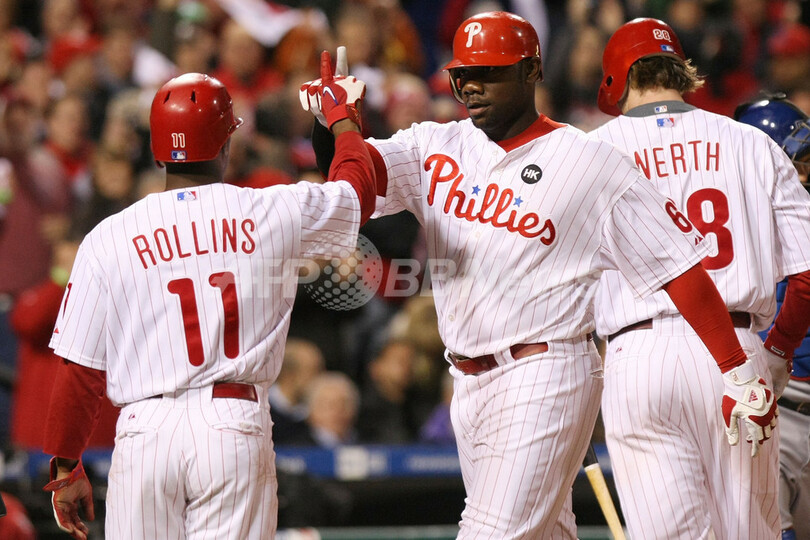 3-4で2点を追うフィリーズは9回裏、2死一、二塁でジミー・ロリンズ(Jimmy Rollins)がドジャースの抑え投手ジョナサン・ブロクストン(Jonathan Broxton)から2点適時二塁打を放ち逆転サヨナラ勝ちを収め、2年連続のワールドシリーズ進出にあと1勝と迫った。(c)AFP