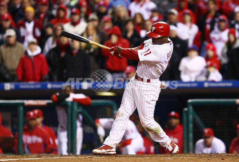 3-4で2点を追うフィリーズは9回裏、2死一、二塁でジミー・ロリンズ(Jimmy Rollins)がドジャースの抑え投手ジョナサン・ブロクストン(Jonathan Broxton)から2点適時二塁打を放ち逆転サヨナラ勝ちを収め、2年連続のワールドシリーズ進出にあと1勝と迫った。(c)AFP