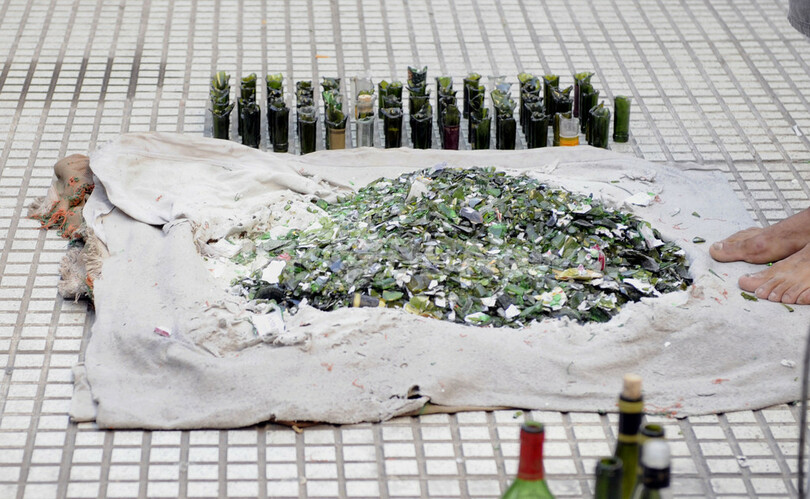 アルゼンチンの首都ブエノスアイレス(Buenos Aires)市街地で20日、ブラジル出身の大道芸人マルコス・アントニオ・ダ・ルス(Marcos Antonio da Luz)さん(34)が、割れたガラスのかけらの上に横たわるなどのパフォーマンスを披露した。マルコスさんは義理の父親から受け継いだこの「技」を観光客や地元住民に披露することで、8年間にわたり生計を立てている。写真は、パフォーマンスのために準備されたガラスのかけら(2009年10月20日撮影)。(c)AFP/DANIEL GARCIA
