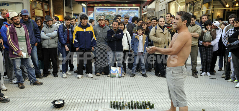 アルゼンチンの首都ブエノスアイレス(Buenos Aires)市街地で20日、ブラジル出身の大道芸人マルコス・アントニオ・ダ・ルス(Marcos Antonio da Luz)さん(34)が、割れたガラスのかけらの上に横たわるなどのパフォーマンスを披露した。マルコスさんは義理の父親から受け継いだこの「技」を観光客や地元住民に披露することで、8年間にわたり生計を立てている。写真は、パフォーマンスを始めるマルコスさん(2009年10月20日撮影)。(c)AFP/DANIEL GARCIA