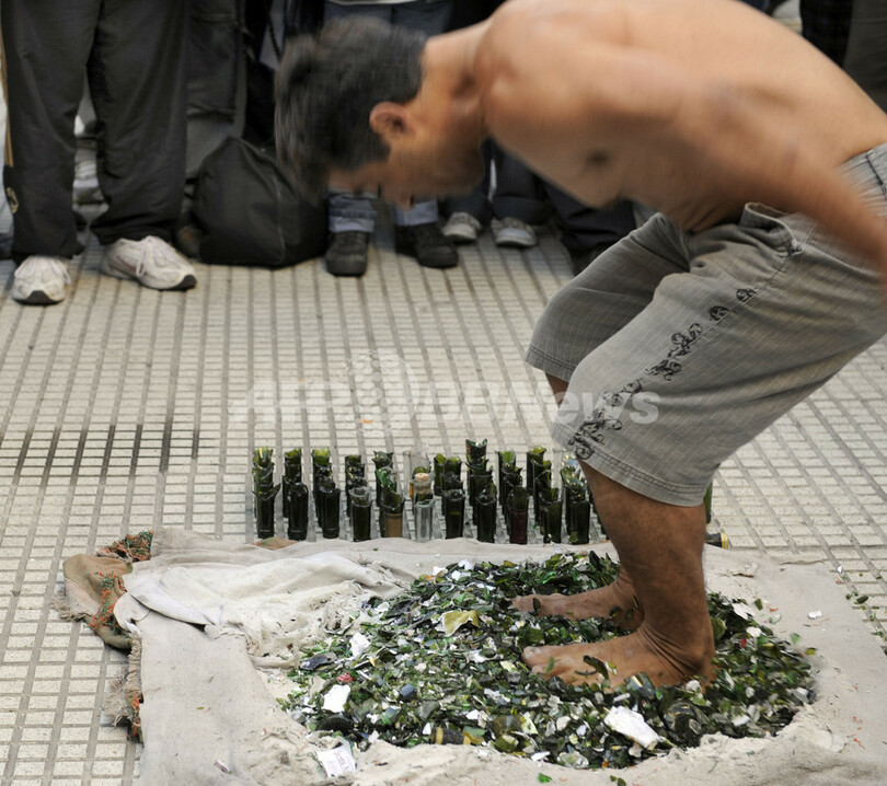 アルゼンチンの首都ブエノスアイレス(Buenos Aires)市街地で20日、ブラジル出身の大道芸人マルコス・アントニオ・ダ・ルス(Marcos Antonio da Luz)さん(34)が、割れたガラスのかけらの上に横たわるなどのパフォーマンスを披露した。マルコスさんは義理の父親から受け継いだこの「技」を観光客や地元住民に披露することで、8年間にわたり生計を立てている。写真は、ガラスのかけらの上に飛び乗るマルコスさん(2009年10月20日撮影)。(c)AFP/DANIEL GARCIA