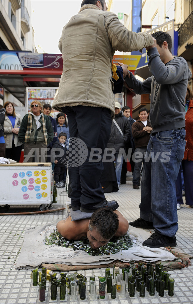 アルゼンチンの首都ブエノスアイレス(Buenos Aires)市街地で20日、ブラジル出身の大道芸人マルコス・アントニオ・ダ・ルス(Marcos Antonio da Luz)さん(34)が、割れたガラスのかけらの上に横たわるなどのパフォーマンスを披露した。マルコスさんは義理の父親から受け継いだこの「技」を観光客や地元住民に披露することで、8年間にわたり生計を立てている。写真は、ガラスのかけらの上に横たわるマルコスさんと、その上に立つ2人の男性(2009年10月20日撮影)。(c)AFP/DANIEL GARCIA