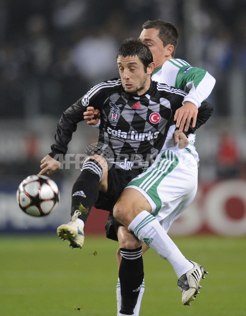サッカー欧州チャンピオンズリーグ2009-10(%%UEFA Champions League 2009-10%%)グループリーグB第3節、VfLボルフスブルク(%%VfL Wolfsburg%%)対ベシクタシュ(%%Besiktas%%)。試合はスコアレスドローに終わった。写真はVfLボルフスブルクのマルセル・シェファー(%%Marcel Schaefer%%、右)とボールを競るベシクタシュのニハト・カフヴェチ(%%Nihat Kahveci%%)。(2009年10月21日撮影)(c)AFP/JOHN MACDOUGALL