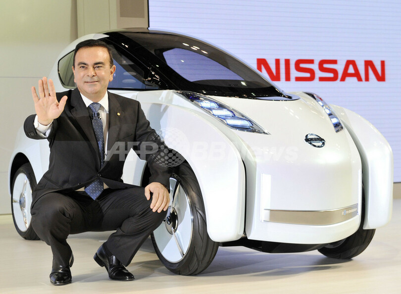 写真は、報道陣向けにコンセプトカー「ランドグライダー(Land Glider)」を披露する日産自動車(Nissan Motor)のカルロス・ゴーン(Carlos Ghosn)会長兼社長。ランドグライダーは、「ナローボディ」の2人乗り用超軽量小型車。(2009年10月21日撮影)。(c)AFP/Yoshikazu TSUNO