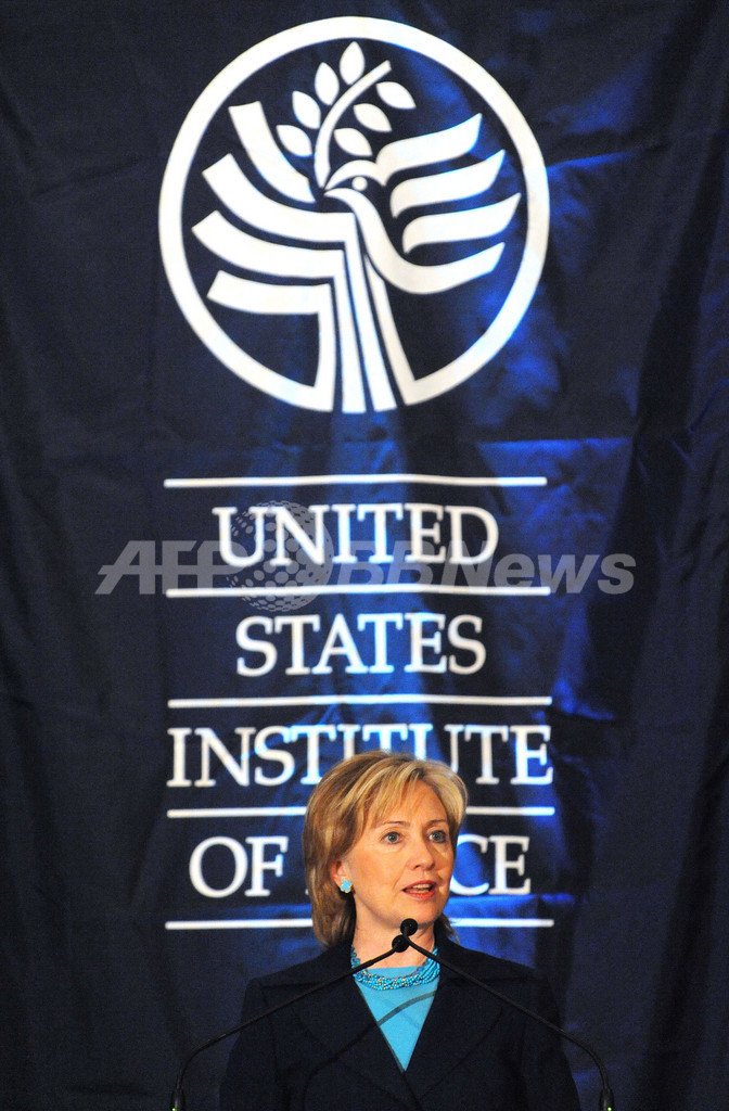 クリントン長官は、シンクタンク「アメリカ平和研究所(United States Institute of Peace)」主催の集会で行った演説で、バラク・オバマ(Barack Obama)政権には引き続き6か国協議の枠内で北朝鮮と直接対話を行う準備があるとした上で、「北朝鮮が交渉の席に復帰するだけでは十分ではない」と発言。「現行の制裁は、北朝鮮が完全な非核化に向けて検証可能かつ不可逆的な措置を取るまで、緩和しない」「北朝鮮の指導者たちは、米国が核武装した北朝鮮と正常な、制裁抜きの関係を持つという幻想を抱くべきではない」などと述べた。(c)AFP/Lachlan Carmichael
