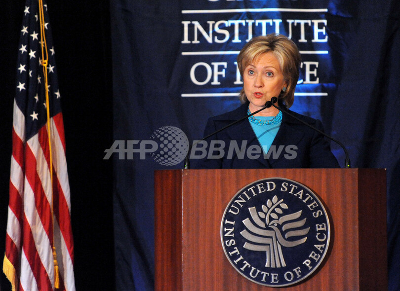 クリントン長官は、シンクタンク「アメリカ平和研究所(United States Institute of Peace)」主催の集会で行った演説で、バラク・オバマ(Barack Obama)政権には引き続き6か国協議の枠内で北朝鮮と直接対話を行う準備があるとした上で、「北朝鮮が交渉の席に復帰するだけでは十分ではない」と発言。「現行の制裁は、北朝鮮が完全な非核化に向けて検証可能かつ不可逆的な措置を取るまで、緩和しない」「北朝鮮の指導者たちは、米国が核武装した北朝鮮と正常な、制裁抜きの関係を持つという幻想を抱くべきではない」などと述べた。(c)AFP/Lachlan Carmichael