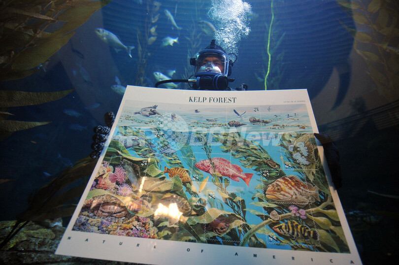 【10月22日 AFP】米国郵便公社(USPS)は21日、カリフォルニア州(California)ロングビーチ(Long Beach)の水族館「ロングビーチ・パシフィック水族館(Long Beach Aquarium of the Pacific)」にある540万立方メートルの巨大水槽「ブルー・カバーン(Blue Cavern、青い洞窟)」の中で、新切手シートの販売促進キャンペーンを行った。この切手シートは国内基本料金の44セント切手で、「ネイチャー・オブ・アメリカ:ケルプ・フォレスト(Nature of America: Kelp Forest、米国の自然:昆布の森)」。「ネイチャー・オブ・アメリカ」シリーズの切手は、1日から全米で発売中。(c)AFP