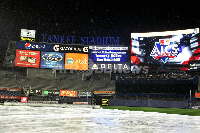 【10月24日 AFP】09MLBプレーオフ、ア・リーグ優勝決定シリーズ(7回戦制)、ニューヨーク・ヤンキース(New York Yankees)対ロサンゼルス・エンゼルス・オブ・アナハイム(Los Angeles Angels of Anaheim)第6戦は24日、ヤンキースの本拠地ヤンキースタジアム(Yankee Stadium)で開催される予定だったが、雨天のため25日に順延となった。