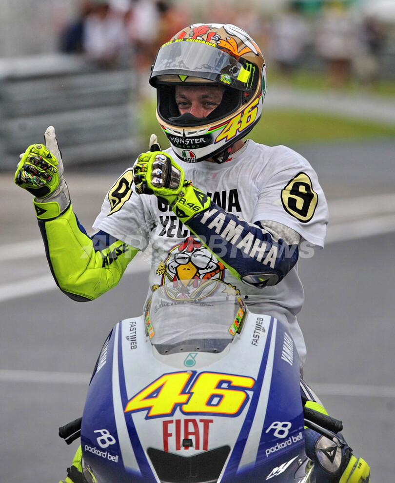 【10月26日 AFP】世界ロードレース選手権(WGP 2009)第16戦マレーシアGP、MotoGPクラス決勝。フィアット・ヤマハ(Fiat Yamaha)のバレンティーノ・ロッシ(Valentino Rossi、イタリア)が、47分44秒219で3位に入り、2年連続7度目の年間総合優勝を決めた。