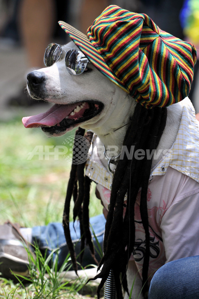 南米コロンビアのバジェデルカウカ(Valle del Cauca)県カリ(Cali)で25日、ファミリー・ペット・フェスティバル(Family Pet Festival)が開催された。写真は、ラスタファリ主義者にふんして参加したイヌ(2009年10月25日撮影)。(c)AFP/Luis ROBAYO