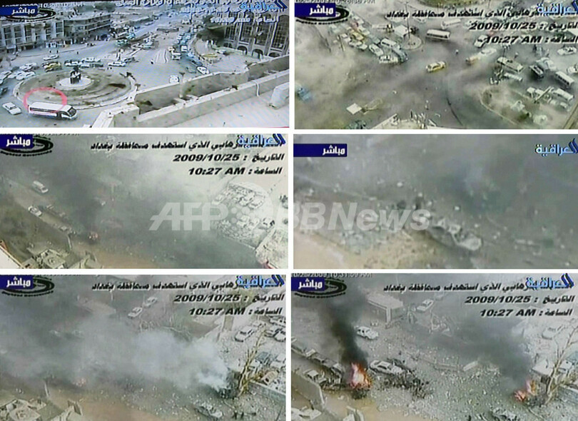 【10月28日 AFP】イラクの政府系テレビ局アルイラキーヤ(Al-Iraqiya)は27日、バグダッド(Baghdad)中心部で25日に発生した2件の自爆攻撃の瞬間をとらえた監視カメラの映像を公開した。カメラは法務省庁舎とバグダッド州庁舎に向かうラウンドアバウトに設置されたもので、攻撃が発生する直前(左上)と直後の現場周辺の様子が映されている。左上の写真の赤い丸で囲った白いバスが自爆車両とみられている。(c)AFP
