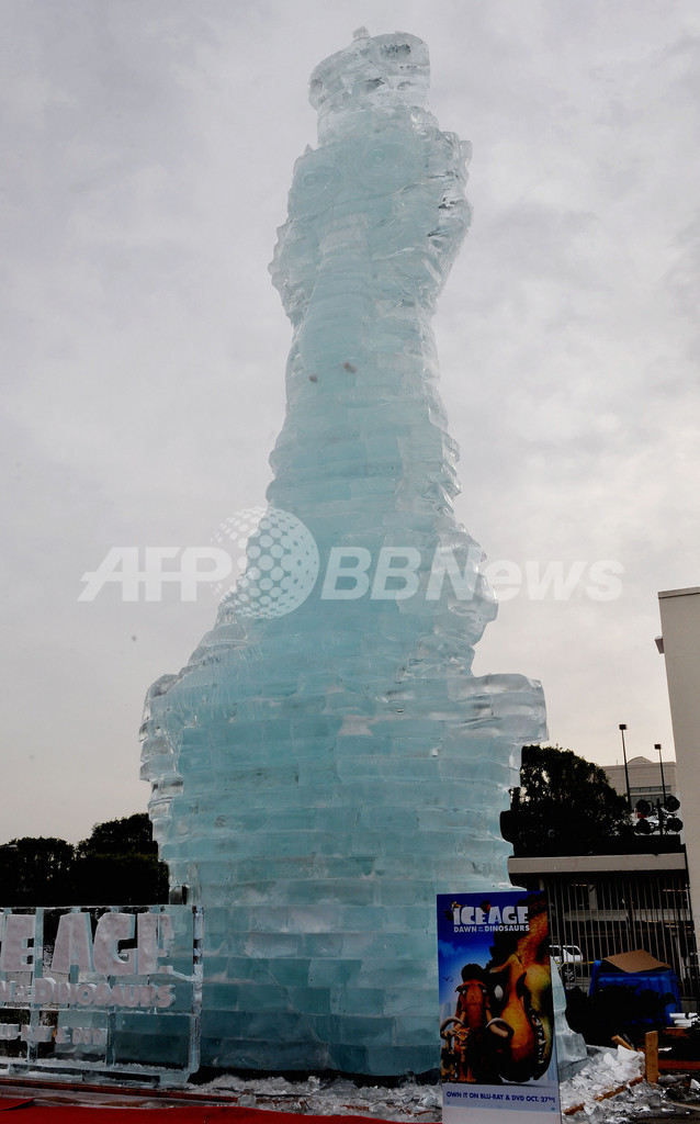 【10月29日 AFP】米サンタモニカ(Santa Monica)で制作された、映画『アイス・エイジ3 ティラノのおとしもの(Ice Age: Dawn of the Dinosaurs)』のキャラクター「スクラット(Scrat)」の巨大な氷の彫刻が27日、世界一高い氷の彫刻としてギネス世界記録(Guinness World Record)に認定された。制作したのはケビン・ロスコー(Kevin Roscoe)さんとピーター・スレイビン(Peter Slavin)さん。高さは約14.6メートルで、約60トンの氷が使用されている。これまでの世界記録は、フランスのミシェル・アマン(Michel Amann)さんが2006年、アラブ首長国連邦ドバイ(Dubai)の室内スキー場「スキー・ドバイ(Ski Dubai)」に作った高さ約12.3メートルの彫刻だった。(c)AFP
