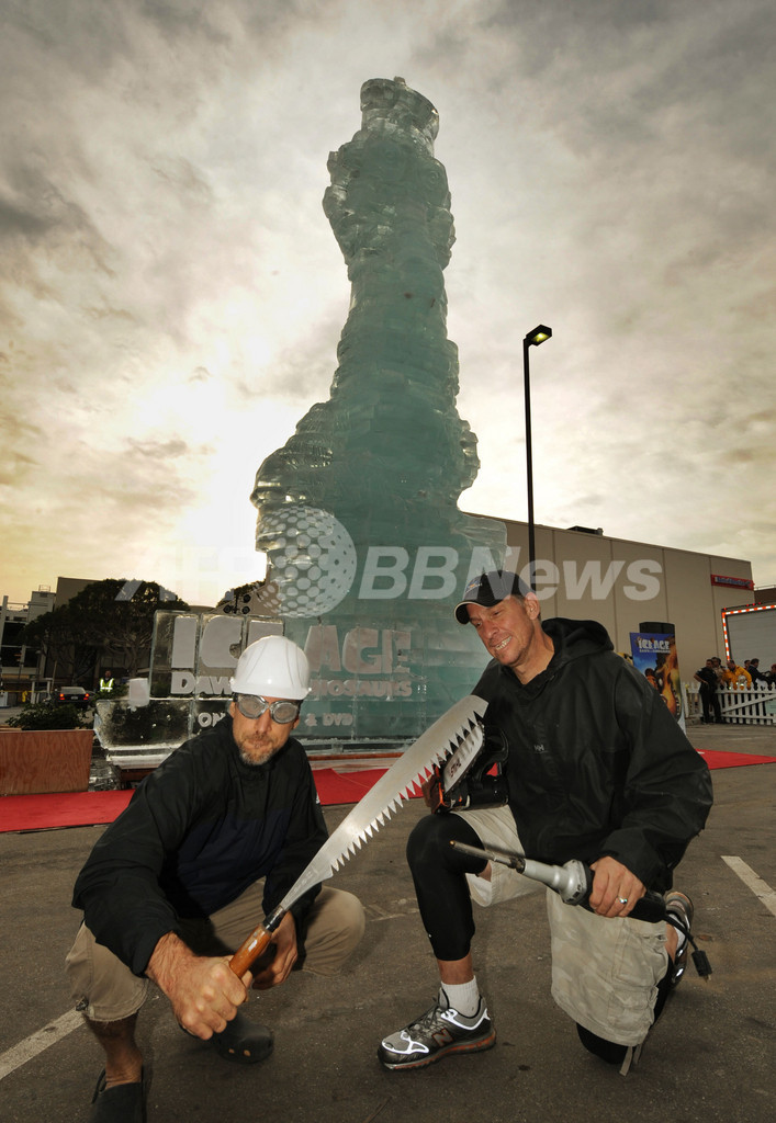 【10月29日 AFP】米サンタモニカ(Santa Monica)で制作された、映画『アイス・エイジ3 ティラノのおとしもの(Ice Age: Dawn of the Dinosaurs)』のキャラクター「スクラット(Scrat)」の巨大な氷の彫刻が27日、世界一高い氷の彫刻としてギネス世界記録(Guinness World Record)に認定された。制作したのはケビン・ロスコー(Kevin Roscoe)さんとピーター・スレイビン(Peter Slavin)さん。高さは約14.6メートルで、約60トンの氷が使用されている。これまでの世界記録は、フランスのミシェル・アマン(Michel Amann)さんが2006年、アラブ首長国連邦ドバイ(Dubai)の室内スキー場「スキー・ドバイ(Ski Dubai)」に作った高さ約12.3メートルの彫刻だった。(c)AFP