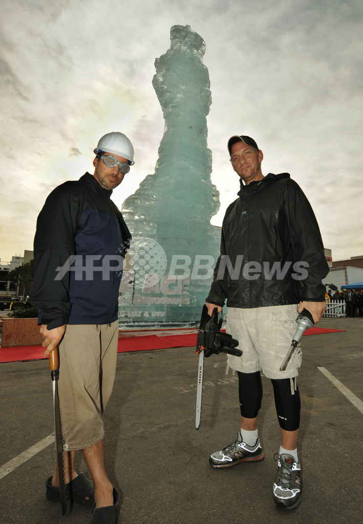 【10月29日 AFP】米サンタモニカ(Santa Monica)で制作された、映画『アイス・エイジ3 ティラノのおとしもの(Ice Age: Dawn of the Dinosaurs)』のキャラクター「スクラット(Scrat)」の巨大な氷の彫刻が27日、世界一高い氷の彫刻としてギネス世界記録(Guinness World Record)に認定された。制作したのはケビン・ロスコー(Kevin Roscoe)さんとピーター・スレイビン(Peter Slavin)さん。高さは約14.6メートルで、約60トンの氷が使用されている。これまでの世界記録は、フランスのミシェル・アマン(Michel Amann)さんが2006年、アラブ首長国連邦ドバイ(Dubai)の室内スキー場「スキー・ドバイ(Ski Dubai)」に作った高さ約12.3メートルの彫刻だった。(c)AFP