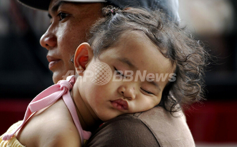 写真はフィリピンのマニラ(Manila)で、子どもを抱いて台風の影響で遅れているバスを待つ万聖節の帰省客(2009年10月30日撮影)(c)AFP/NOEL CELIS