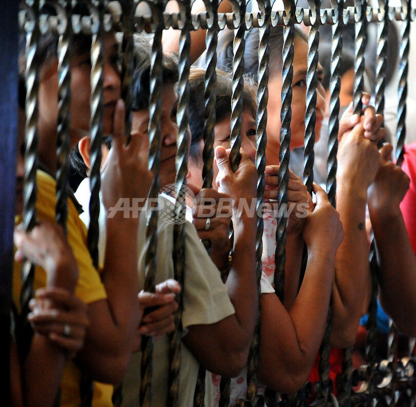 写真はフィリピンのマニラの南にあるラグーナ州(Laguna)ビナン(Binan)で、救援物資の配給の順番を待つ台風の被災者(2009年10月28日撮影)(c)AFP/TED ALJIBE