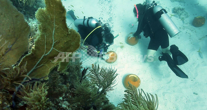 【10月31日 AFP】米フロリダ(Florida)州キー・ラーゴ(Key Largo)沖にあるフロリダキーズ連邦海洋保護区(Florida Keys National Marine Sanctuary)で30日、恒例の水中パンプキン彫刻コンテストが行われた。このコンテストは毎年ハロウィーンの直前に同地のダイビングリゾートAmoray Dive Resortが行っている。(c)AFP