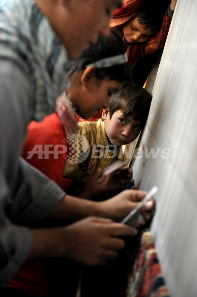 【11月1日 AFP】写真はアフガニスタンのじゅうたん織り工房で働く少年少女たち。アフガニスタンでは多くの子どもたちが、読み書きを覚えるのもそこそこに、家計を助けるために働いている。午前中働き、午後に学校に行く子もいる。そうした子どもたちの家族は、約30年にもわたる国内の混乱でパキスタンなど周辺国に流出し、最近帰国した難民たちだ。
