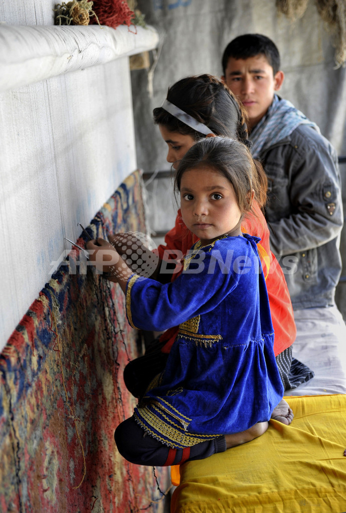 【11月1日 AFP】写真はアフガニスタンのじゅうたん織り工房で働く少年少女たち。アフガニスタンでは多くの子どもたちが、読み書きを覚えるのもそこそこに、家計を助けるために働いている。午前中働き、午後に学校に行く子もいる。そうした子どもたちの家族は、約30年にもわたる国内の混乱でパキスタンなど周辺国に流出し、最近帰国した難民たちだ。