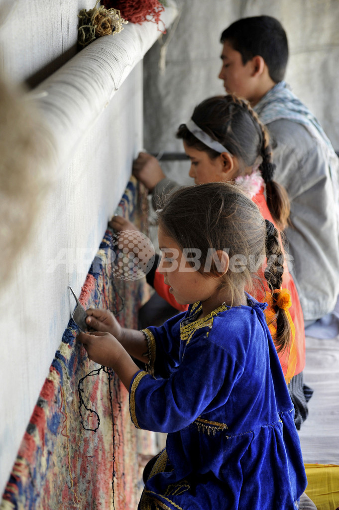 【11月1日 AFP】写真はアフガニスタンのじゅうたん織り工房で働く少年少女たち。アフガニスタンでは多くの子どもたちが、読み書きを覚えるのもそこそこに、家計を助けるために働いている。午前中働き、午後に学校に行く子もいる。そうした子どもたちの家族は、約30年にもわたる国内の混乱でパキスタンなど周辺国に流出し、最近帰国した難民たちだ。