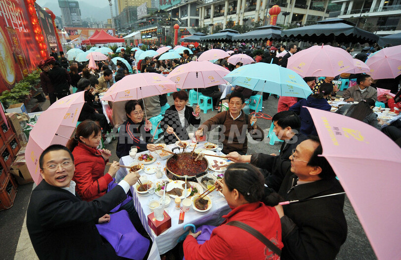 ニュース ライフ 鍋フェスティバルが大盛況、重慶市 2009年11月1日 23:20 発信地:重慶/中国 [ 中国・台湾 中国 ] このニュースをシェア ‹ › ❮ 5/8 ❯ 中国南西部の重慶(Chongqing)市で31日に行われた鍋料理フェスティバルで、伝統の地元料理「重慶火鍋(四川火鍋)」がふるまわれ、来場者数千人が冬の味覚を楽しんだ。写真は鍋フェスティバルで雨の中、傘をさしながら屋台の鍋を楽しむ人たち(2009年10月31日撮影)。(c)AFP 画像作成中 ! 【11月1日 AFP】中国南西部の重慶(Chongqing)市で31日に行われた鍋料理フェスティバルで、伝統の地元料理「重慶火鍋(四川火鍋)」がふるまわれ、来場者数千人が冬の味覚を楽しんだ。(c)AFP ライフ 一覧へ> メディア・報道関係・法人の方向け 写真・動画 購入のお問合せ>