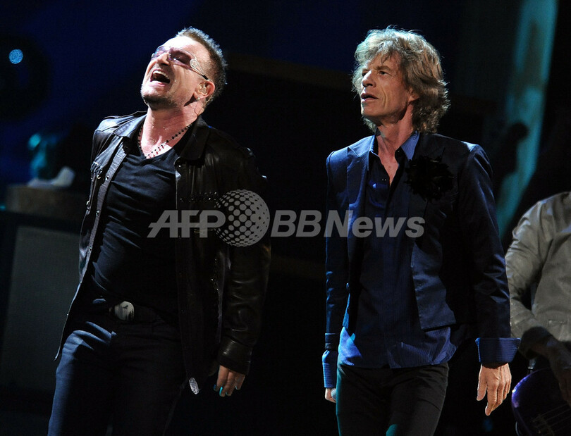 米ニューヨーク(New York)のマディソンスクエアガーデン(Madison Square Garden)で29日から2日間、「ロックの殿堂(Rock and Roll Hall of Fame)」25周年記念コンサートが開催され、大物ミュージシャンが次々に登場した。写真は、ステージに登場したローリング・ストーンズ(The Rolling Stones)のミック・ジャガー(Mick Jagger、右)とU2のボノ(Bono、2009年10月30日撮影)。(c)AFP/Getty Images/Stephen Lovekin
