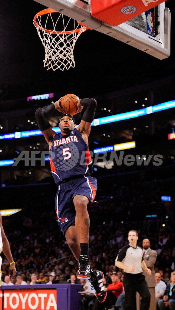 シーズン初黒星を喫したホークスは、第1クォーターに18得点を記録したジョー・ジョンソン(Joe Johnson)が27得点、ジャマール・クロフォード(Jamal Crawford)が17得点、マイク・ビビー(Mike Bibby)が15得点、新人のジェフ・ティアグ(Jeff Teague)が12得点を記録したが、第3クォーターのレイカーズの攻撃を止めることができず突き放された。(c)AFP