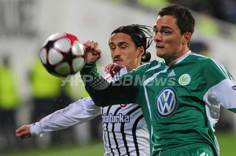 欧州チャンピオンズリーグ2009-10(%%UEFA Champions League 2009-10%%)グループB第4節、ベシクタシュ(%%Besiktas%%)対VfLボルフスブルク(%%VfL Wolfsburg%%)。試合はボルフスブルクが3-0で快勝した。写真はベシクタシュのセルダル・オズカン(%%Serdar Ozkan%%)とボールを競るボルフスブルクのマルセル・シェファー(%%Marcel Schaefer%%、右)。(2009年11月3日撮影)(c)AFP/MUSTAFA OZER