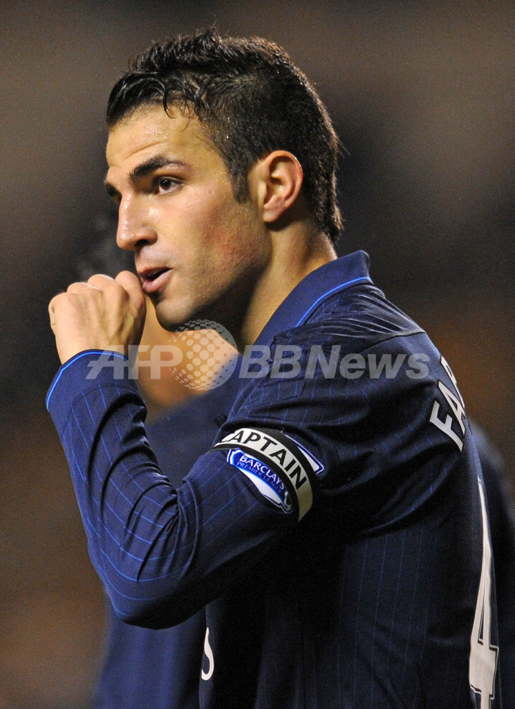 09-10イングランド・プレミアリーグ、ウォルバーハンプトン・ワンダラーズ(%%Wolverhampton Wanderers%%)対アーセナル(%%Arsenal%%)。試合はアーセナルが4-1で勝利した。写真は前半ロスタイムにチーム3得点目を挙げて歓喜するアーセナルのセスク・ファブレガス(%%Cesc Fabregas%%)。(2009年11月7日撮影)(c)AFP/Paul Ellis