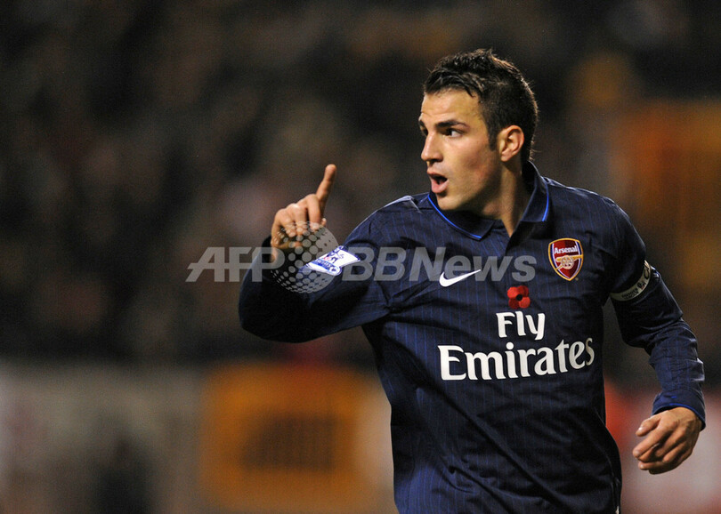 09-10イングランド・プレミアリーグ、ウォルバーハンプトン・ワンダラーズ(%%Wolverhampton Wanderers%%)対アーセナル(%%Arsenal%%)。試合はアーセナルが4-1で勝利した。写真は前半ロスタイムにチーム3得点目を挙げて歓喜するアーセナルのセスク・ファブレガス(%%Cesc Fabregas%%)。(2009年11月7日撮影)(c)AFP/Paul Ellis