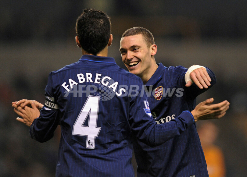 09-10イングランド・プレミアリーグ、ウォルバーハンプトン・ワンダラーズ(%%Wolverhampton Wanderers%%)対アーセナル(%%Arsenal%%)。試合はアーセナルが4-1で勝利した。写真は前半ロスタイムにチーム3得点目を挙げたセスク・ファブレガス(%%Cesc Fabregas%%)を祝福するアーセナルのトーマス・フェルマーレン(%%Thomas Vermaelen%%、右)。(2009年11月7日撮影)(c)AFP/Paul Ellis
