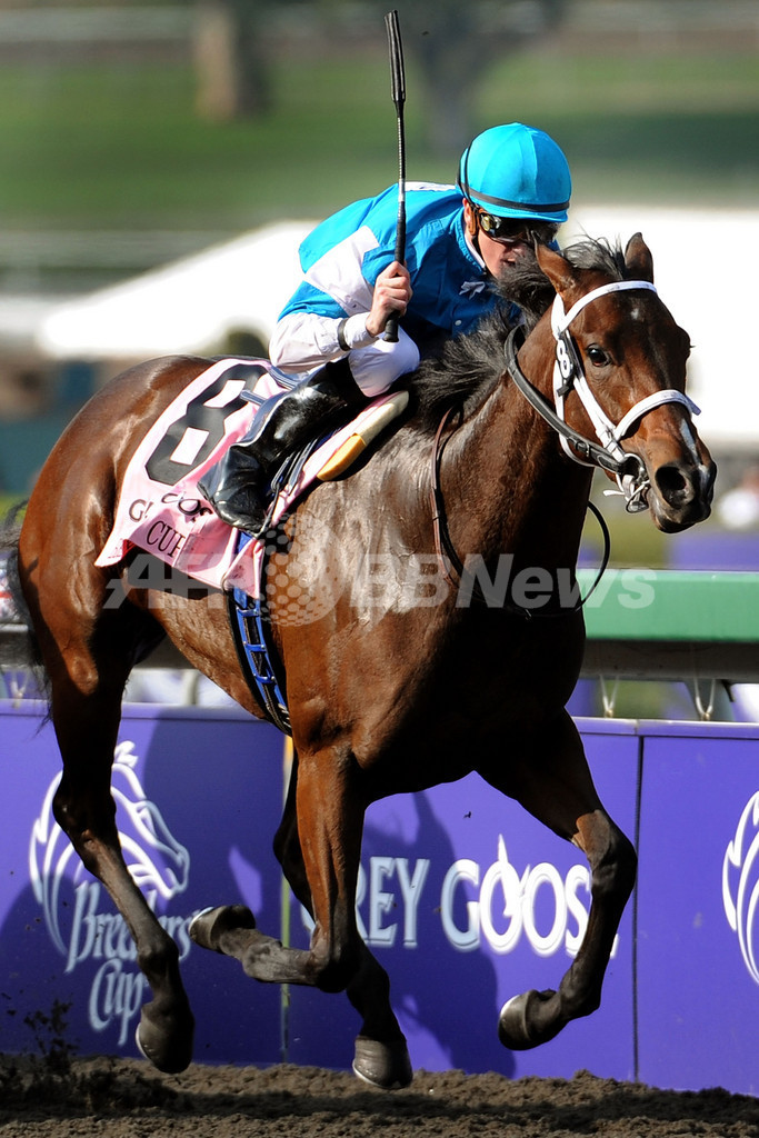競馬のブリーダーズカップ・ワールド・チャンピオンシップ(%%Breeders' Cup World Thoroughbred Championships 2009%%)が6日、カリフォルニア(California)州のサンタアニタパーク(Santa Anita Park)競馬場で開催された。ブリーダーズカップは2日間開催で全14レースが行われる。写真はブリーダーズカップ・ジュヴェナイルフィリーズ(%%Breeders' Cup Juvenile Fillies%%、ダート1700メートル)を制したジュリアン・ルパルー(%%Julien Leparoux%%)騎手騎乗のシービーワイルド(%%She Be Wild%%、牝2歳)。(2009年11月6日撮影)(c)AFP/Getty Images/Harry How