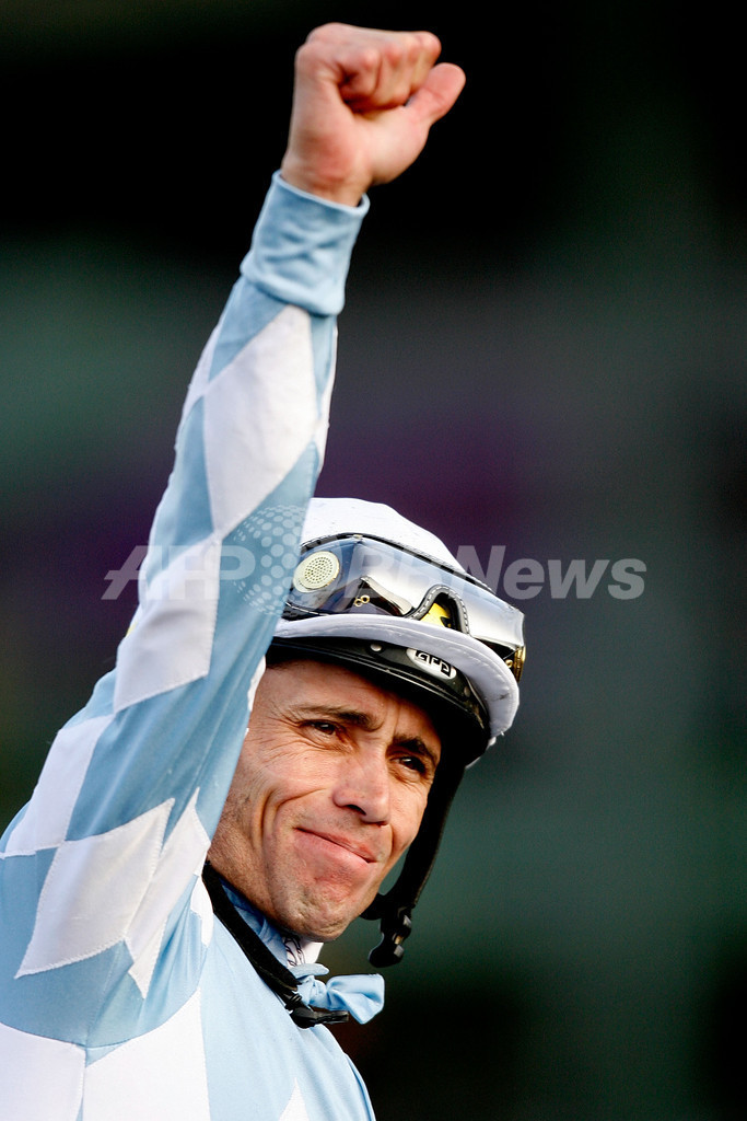 競馬のブリーダーズカップ・ワールド・チャンピオンシップ(%%Breeders' Cup World Thoroughbred Championships 2009%%)が6日、カリフォルニア(California)州のサンタアニタパーク(Santa Anita Park)競馬場で開催された。ブリーダーズカップは2日間開催で全14レースが行われる。写真はライフイズスウィート(%%Life is Sweet%%、牝4歳)に騎乗してブリーダーズカップ・レディーズクラシック(%%Breeders' Cup Ladies' Classic%%、ダート1800メートル)を制し、歓喜するギャレット・ゴメス(%%Garrett Gomez%%)騎手。(2009年11月6日撮影)(c)AFP/Getty Images/Matthew Stockman