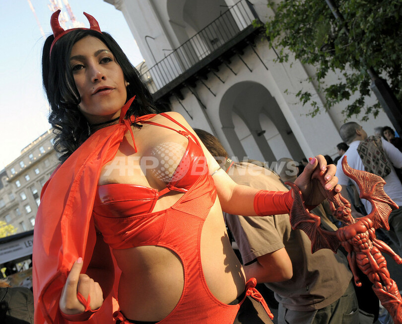 同性愛者らの権利擁護を訴えるゲイ・プライド・パレード(Gay Pride Parade)が7日、アルゼンチンのブエノスアイレス(Buenos Aires)で開かれた。写真は、悪魔のコスプレをしたトランスセクシュアルの参加者(2009年11月7日撮影)。(c)AFP/JUAN MABROMATA
