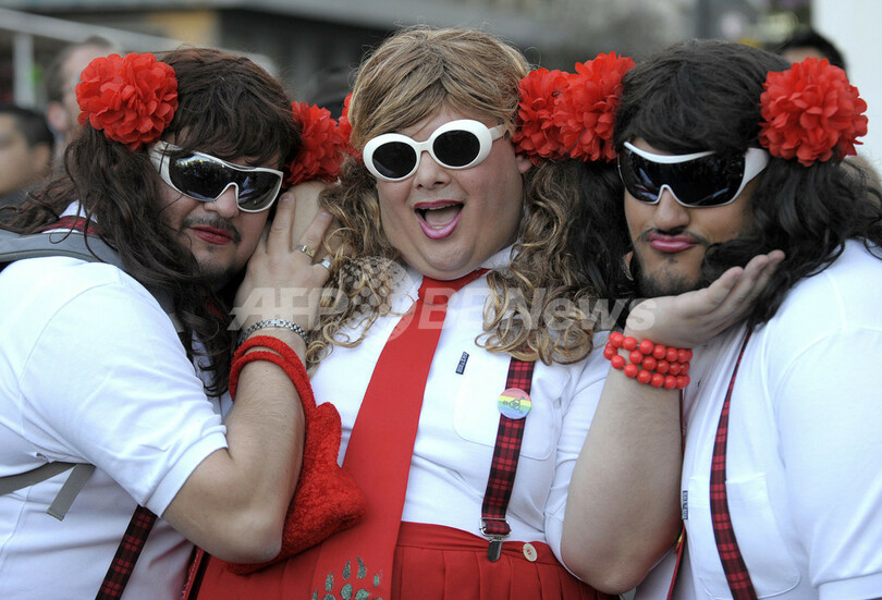 同性愛者らの権利擁護を訴えるゲイ・プライド・パレード(Gay Pride Parade)が7日、アルゼンチンのブエノスアイレス(Buenos Aires)で開かれた。写真は、コスチュームに身を包んだ男性の参加者ら(2009年11月7日撮影)。(c)AFP/JUAN MABROMATA