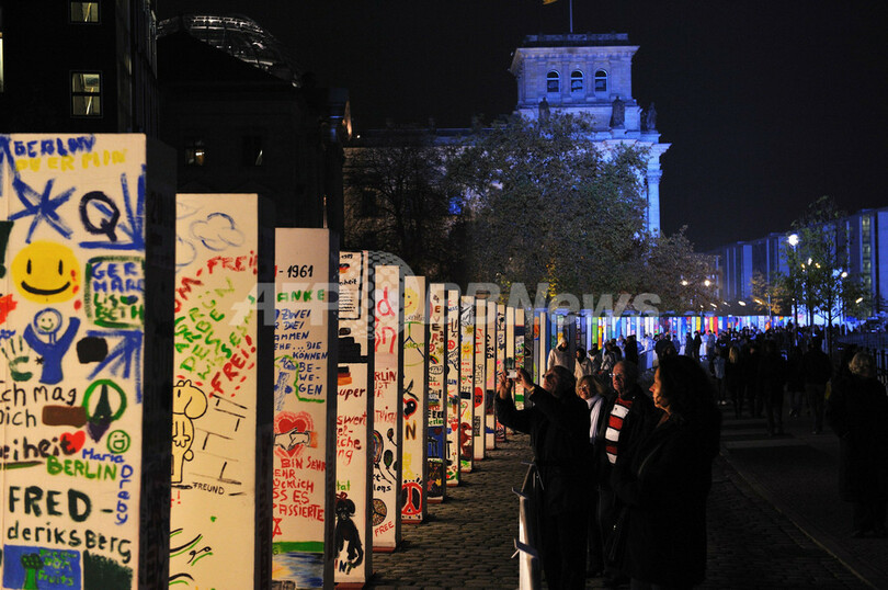 ニュース 政治・経済 ベルリンに巨大ドミノ1000枚登場、「壁」崩壊20周年式典 2009年11月9日 10:42 発信地:ベルリン/ドイツ [ ヨーロッパ ドイツ ] このニュースをシェア ‹ › ❮ 1/60 ❯ ドイツのベルリン(Berlin)中心部で8日、翌日の「ベルリンの壁(Berlin Wall)」崩壊20周年を前に、記念式典で倒される1000枚の「巨大ドミノ」の設営が進められた。巨大ドミノは、子供たちを中心に約1万5000人の参加者が描いた絵で彩られており、式典でポーランドのレフ・ワレサ(Lech Walesa)元大統領が最初の1枚を倒す予定。ベルリンの壁があった場所に沿って並べられている。写真は、スポットライトを浴びる巨大ドミノ(2009年11月8日撮影)。(c)AFP/JERIC FEFERBERG 画像作成中 ! 【11月8日 AFP】ドイツのベルリン(Berlin)中心部で8日、翌日の「ベルリンの壁(Berlin Wall)」崩壊20周年を前に、記念式典で倒される1000枚の「巨大ドミノ」の設営が進められた。(c)AFP 政治・経済 一覧へ> メディア・報道関係・法人の方向け 写真・動画 購入のお問合せ>