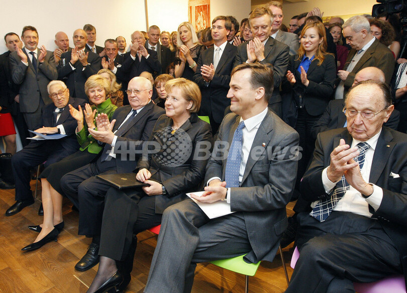 写真は同博物館の開館式に出席するヘンリー・キッシンジャー(Henry Kissinger)元米国務長官(左)、ミハイル・ゴルバチョフ(Mikhail Gorbachev)元ソ連大統領(左から3人目)、アンゲラ・メルケル(Angela Merkel)独首相(右から3人目)、ポーランドのラドスワフ・シコルスキ(Radoslaw Sikorski)外相(右から2人目)、ハンス・ディートリヒ・ゲンシャー(Hans-Dietrich Genscher)元ドイツ外相(右、2009年11月8日撮影)。(c)AFP/DDP/BERND SETTNIK